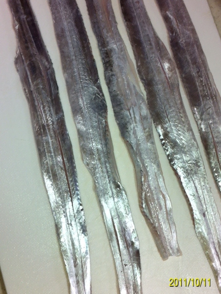 先ずは3枚におろしたタチウオの皮の部分に包丁で2本の切れ目を入れます。