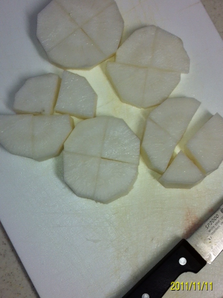 鍋に大根とカンパチのアラを入れて煮込みます。