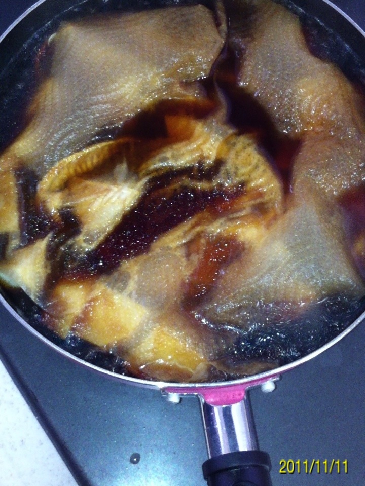 大根にタレの色が染み込んできたら、火を止めて冷まして味を染み込ませます。