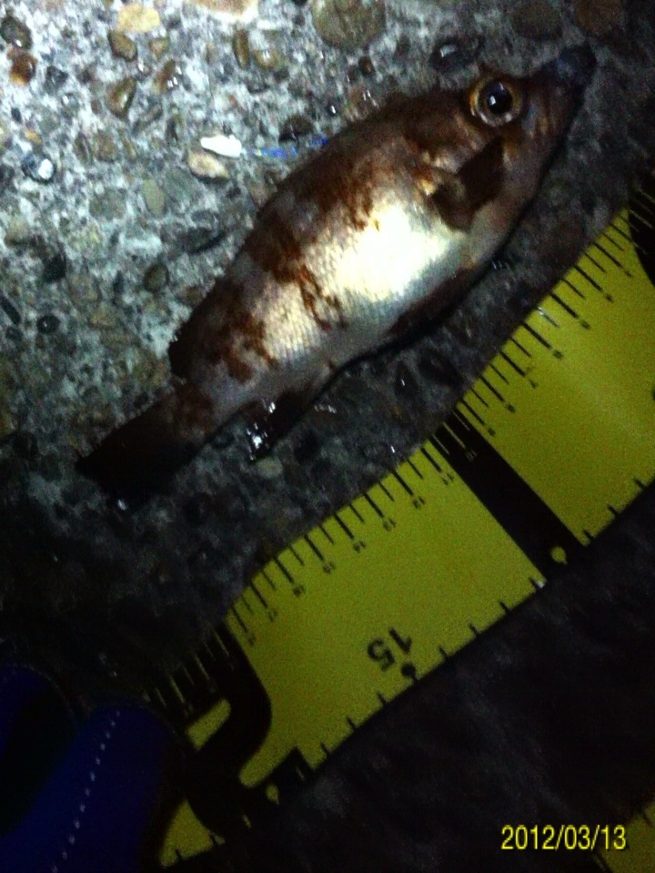 和歌山市内のマイポイントに釣りに行ってきました。 二日間パラパラと降り続いた雨、どんな影響があるのか? 先日はアジがいい感じに釣れ、メバルの活性も悪くは無かったのですが・・・ 数日前までの釣行ではアジやメバルの胃袋の中に、ボラの稚魚やシラス?のような魚が沢山入っていました。 アジのベイトチェック画像 メバルのベイトチェック画像 今回一番やりたい釣りは、アジングでのボラ稚魚パターンなのですが、イマイチのようで有れば、メバルやシーバス狙いにチェンジしたいと考えています。 気になる当日のコンディション 天気:晴れ 気温:11~12度 風:西の風5~6m 潮:大潮の底からの上げパターン 気温も上がり、潮も上げ潮、適度な風 申し分なさそう・・・かな? 今朝電車の中から紀ノ川の状態を確認・・・ うーん微妙な濁り・・・ 今回は何と、ロッド3本持参です。 ジグヘッド用、ハードルアー用、フロートリグ用です。 持ち運ぶのは面倒ですが、ポイントに着いたら足元にセットして置いておけば、使いたい時にスグに使える。 一本のロッドでもいいのですが、リグりなおすのが面倒だし、時間のロスもあり効率も悪くなりますもんね。 この重装備!! もはやライトゲームでは無い??? とにかくスタートフィッシングです(^_^;) まずはジグヘッドリグからスタート 0.4gのジグヘッドに2.3インチのクリアカラーワームをセットして、表層をデッドスローでただ巻き。 何回キャストしても、かすりもしません(^_^;) フローティングミノーにチェンジです。 が、こちらも全くアタリ無し・・・ 約2時間経過 坊主で帰るのは嫌なので、とりあえずガシラを一匹だけでも釣ろうと思い、得意のキャロに変更。 そして、最近僕の中では禁じ手にしていた【ガルプ サンドワーム】登場!! キャストしてキャロをボトムまで落として、リフト&フォール すると・・・・ ゴツッ!! きました(^_^) 困った時はガシラ様ですね(^_^;) ただし、【ガルプ】(エサ?)で釣りました(^_^;) 釣るのはメバルやアジよりも楽だし食べても美味しいし、いつも助けていただいております・・・ 坊主は逃れたので、少し場所を移動してメバルを狙います。 移動してスグにメバルのアタリがきました!! いつもはクリアカラーのワームを使うのですが、今夜は雨の影響で水が濁っているので少し派手めのカラーにするとスグに釣れました。 しかし後が続かない・・・ 試行錯誤の末、クリアカラーのミノーにチェンジすると・・・ きました!! でもメバルの引きじゃない!! 軽かったので抜き上げてみると・・・ ホンマに小さいシーバスちゃんでした(^_^;) その後もチーバスのアタックはあるものの、針にのらないアタリばかりが続いたので、これでストップフィッシングとしました。 最終釣果 ガシラ×1 メバル×1(リリース) シーバス×1(リリース) 雨の後のライトゲームはチョット厳しかったです(^_^;) 次回リベンジ!! 「にほんブログ村」海釣り部門人気ランキングに参加中です。面白い!参考になった!他の方の釣りブログも見てみたい!と思われた方は下のアイコンをクリックして下さい(^-^)/ にほんブログ村 |