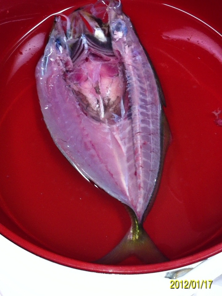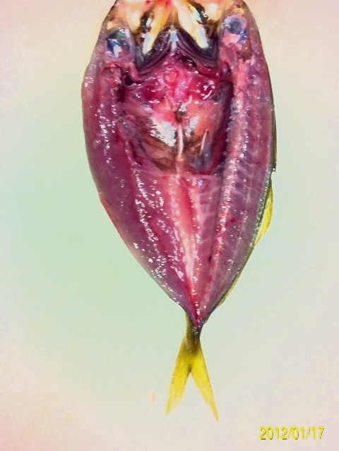 ウロコを取り除き、開いてワタ、エラを取ります。 海水程度の辛さの塩水に約1時間漬け込みます。 その後、水分をキッチンペーパー等でとり、冷蔵庫で24時間乾燥させます。 アルミホイルの上に乗せ、オーブントースターで焼きます。 両面に程よい焦げ目が付いたら完成です。 レモンを絞って、熱いうちに食べるのが最高です!! アジやタチウオは、一夜干しが一番美味い気がします。 酒の肴に最高ですよ~(^-^) にほんブログ村 |