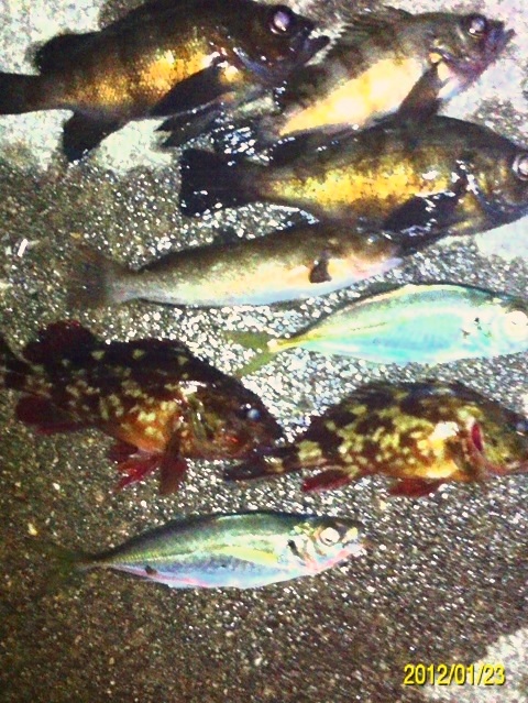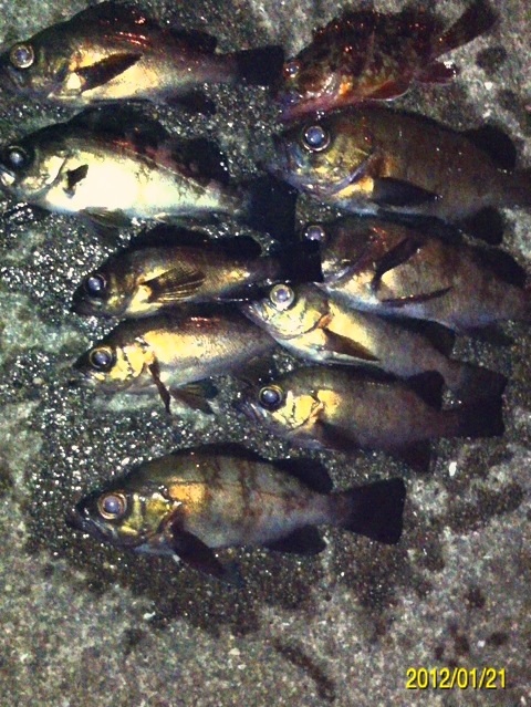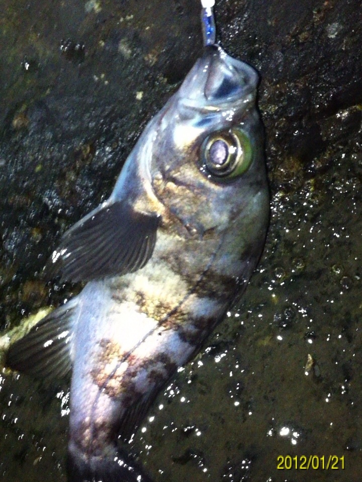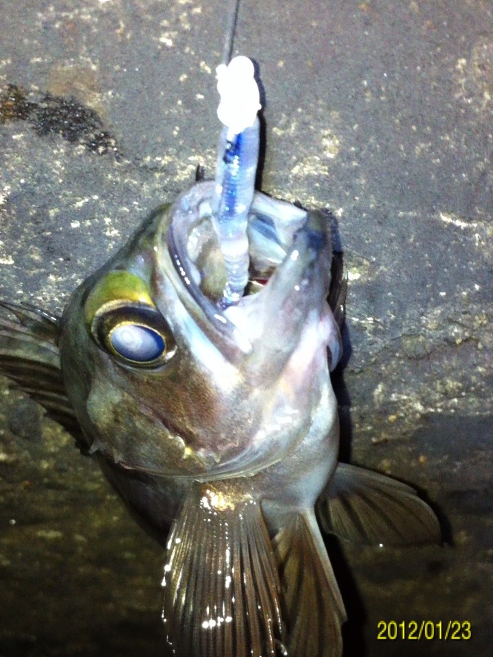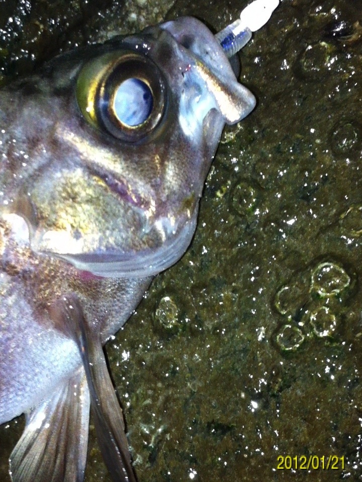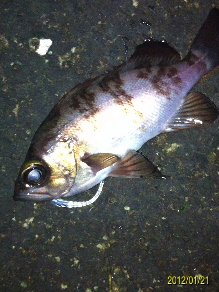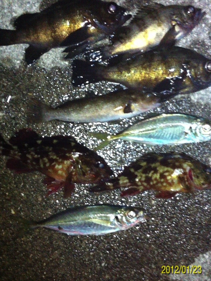 和歌山市内の防波堤でライトゲームをしました。 天気:曇り 気温:6度 風:北東3m 潮:大潮の上げ 前回好調だったメバリングですが、今夜も楽しませて貰えるのかな(^-^) ポイントに到着後、まずは坊主逃れの為に常夜灯下に向かいます。 先日と同様のリグ(ジグヘッド0.4g+クリアカラーワーム)でキャスト開始。 着水して5カウント・・・レンジをキープしながら、もうこれ以上ゆっくり巻けないと言う位のスピードでリトリーブ・・・ コツンッ!! 触った!! けど、フックにのってない・・・ 我慢してそのまま巻いていると・・・ コンッ!!ググググンッ!! きました~!! リリースサイズのメバルでした(^_^;) 先日も記載しましたが、リリースサイズが釣れた場所でまだ釣りをするので有れば、その場にリリースせずに離れた所にリリースしましょう。 面倒だけど、ポイントの活性は保つことができます。 と言うわけで、離れた所にリリースしました(^-^) その後もスグに・・・ 2匹目 3匹目 4匹目 5匹目 6匹目 爆釣です!! 立て続けにリリースサイズが、ほぼ入れ食い状態です。 もう面倒なので、バッカンに海水を入れて活かしておいて最後にリリースします(^^;; こんな時は定期的にバッカンの海水を入れ替えしましょう!! 入れ替え無ければ、酸欠になって死んでしまいます。 その後、表層付近で・・・ こんなものが喰ってきました。 いいサイズの小アジです。 連チャンできました!! 今夜はメバルがターゲットなので、気を取り直して少しレンジを下げてみると・・・ 7匹目 8匹目 9匹目 10匹目 11匹目 今まで仕留めたメバルは全てリリースサイズです(^^;; このままではメバルのお土産が無い・・・ヤバイ(^_^;) 常夜灯下は小さいメバルばかりなので諦めて、暗闇ゾーンで勝負することにしました。 大きなメバルはボトム付近にいると聞いたことがあったので、ボトムを攻めてみると・・・。 喰ってきたのは アイナメでした(^_^;) その後も暗闇ゾーンでボトム付近をリトリーブしていると・・・ まあまあのサイズのガシラ 次も・・・ 底を引っ張るとガシラに当たってしまう(^_^;) でも美味しいので持ち帰り決定。 そして・・・ やっとそこそこのサイズのメバルがきました。 良型は常夜灯よりも暗闇ゾーンの方が良さそうです(^-^) そして終了間際にも メバルは全部で13匹でした。 撮影後スグにリリースサイズのメバルを海に放流・・・ 残った子達です。 今回わかったこと・・・ ・常夜灯周りはサイズが小さいメバルが多い。 ・良型は暗い場所で深めのレンジ(底を若干切ること)を通すと確立アップ。 ・底を切らなければ、ガシラやアイナメに当たる。 今回は短時間で色んな魚達に出会えました(^-^) 今夜の晩御飯の食材にします(^-^)/ にほんブログ村 |