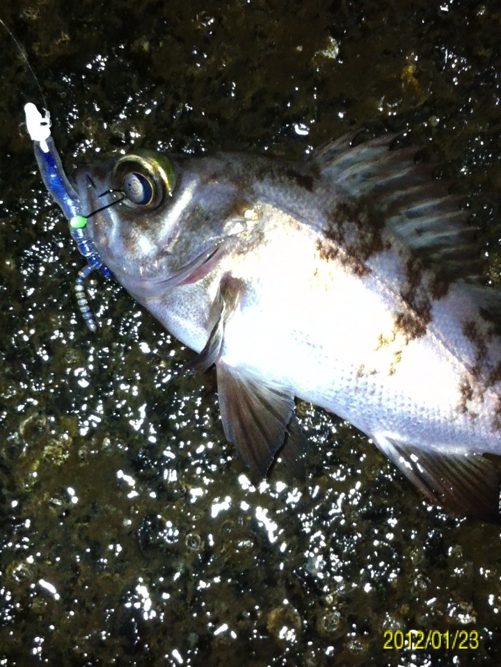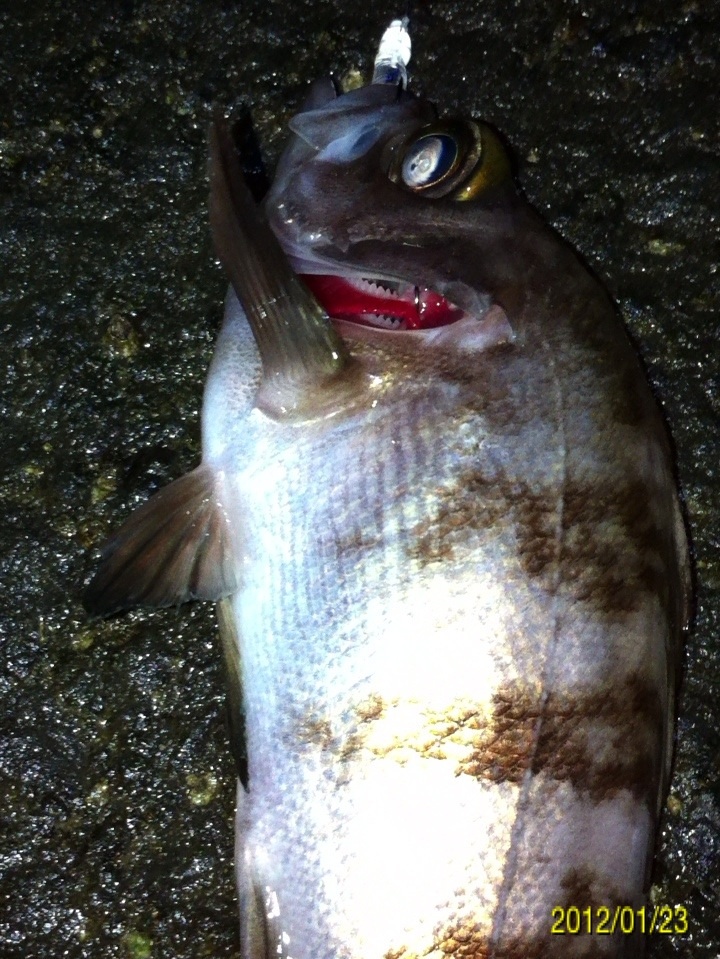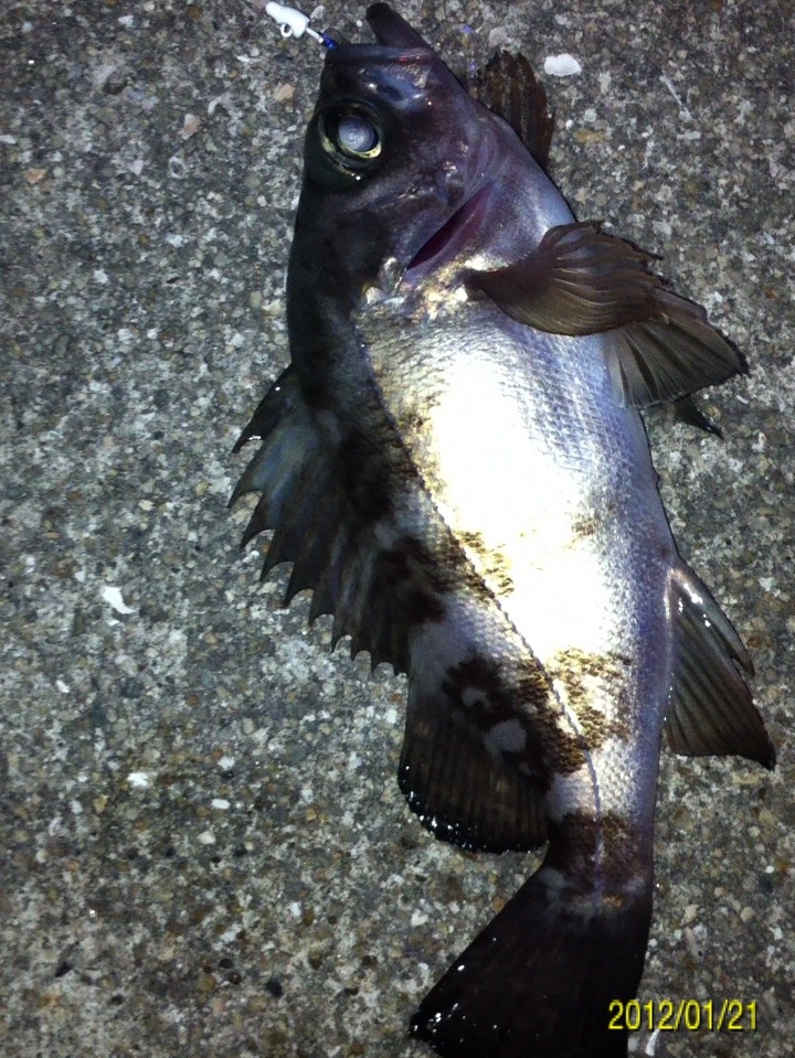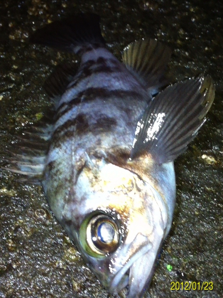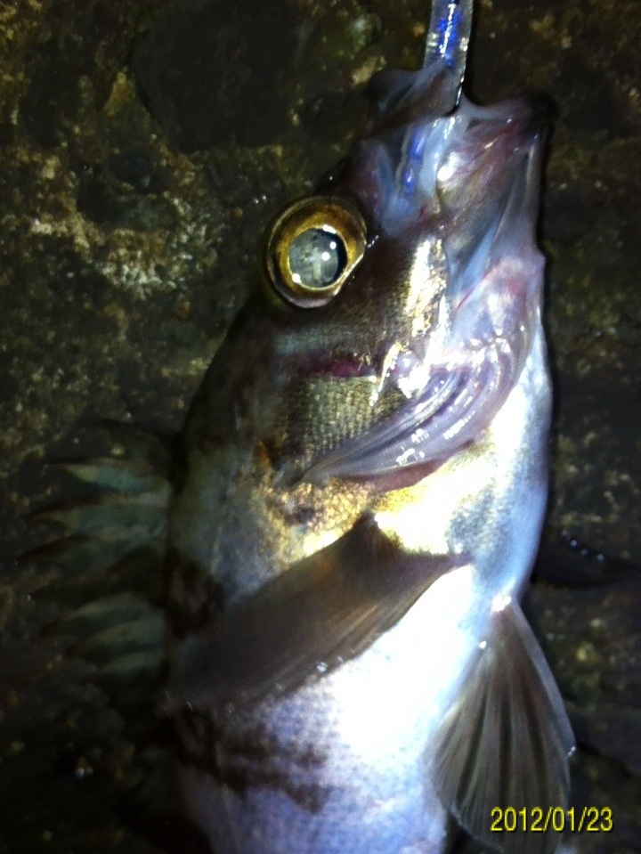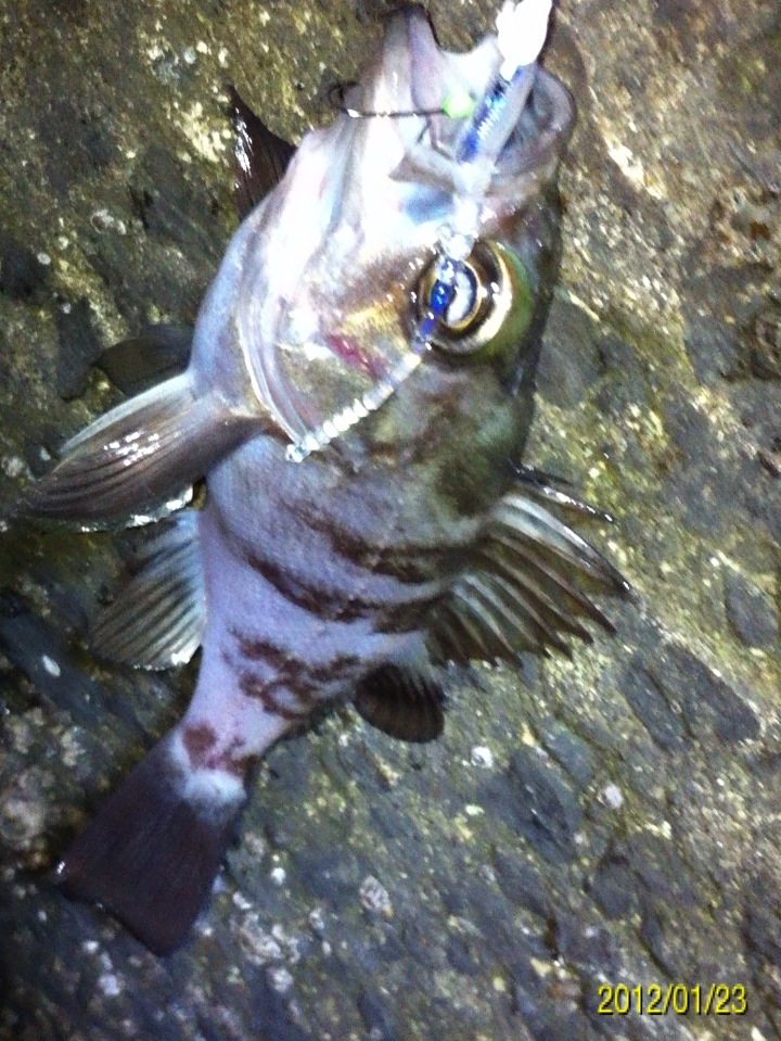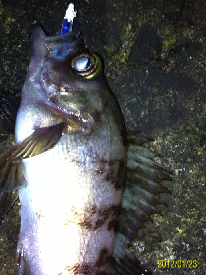 和歌山市内の防波堤でライトゲームをしました。 天気:曇り 気温:6度 風:北東3m 潮:大潮の上げ 前回好調だったメバリングですが、今夜も楽しませて貰えるのかな(^-^) ポイントに到着後、まずは坊主逃れの為に常夜灯下に向かいます。 先日と同様のリグ(ジグヘッド0.4g+クリアカラーワーム)でキャスト開始。 着水して5カウント・・・レンジをキープしながら、もうこれ以上ゆっくり巻けないと言う位のスピードでリトリーブ・・・ コツンッ!! 触った!! けど、フックにのってない・・・ 我慢してそのまま巻いていると・・・ コンッ!!ググググンッ!! きました~!! リリースサイズのメバルでした(^_^;) 先日も記載しましたが、リリースサイズが釣れた場所でまだ釣りをするので有れば、その場にリリースせずに離れた所にリリースしましょう。 面倒だけど、ポイントの活性は保つことができます。 と言うわけで、離れた所にリリースしました(^-^) その後もスグに・・・ 2匹目 3匹目 4匹目 5匹目 6匹目 爆釣です!! 立て続けにリリースサイズが、ほぼ入れ食い状態です。 もう面倒なので、バッカンに海水を入れて活かしておいて最後にリリースします(^^;; こんな時は定期的にバッカンの海水を入れ替えしましょう!! 入れ替え無ければ、酸欠になって死んでしまいます。 その後、表層付近で・・・ こんなものが喰ってきました。 いいサイズの小アジです。 連チャンできました!! 今夜はメバルがターゲットなので、気を取り直して少しレンジを下げてみると・・・ 7匹目 8匹目 9匹目 10匹目 11匹目 今まで仕留めたメバルは全てリリースサイズです(^^;; このままではメバルのお土産が無い・・・ヤバイ(^_^;) 常夜灯下は小さいメバルばかりなので諦めて、暗闇ゾーンで勝負することにしました。 大きなメバルはボトム付近にいると聞いたことがあったので、ボトムを攻めてみると・・・。 喰ってきたのは アイナメでした(^_^;) その後も暗闇ゾーンでボトム付近をリトリーブしていると・・・ まあまあのサイズのガシラ 次も・・・ 底を引っ張るとガシラに当たってしまう(^_^;) でも美味しいので持ち帰り決定。 そして・・・ やっとそこそこのサイズのメバルがきました。 良型は常夜灯よりも暗闇ゾーンの方が良さそうです(^-^) そして終了間際にも メバルは全部で13匹でした。 撮影後スグにリリースサイズのメバルを海に放流・・・ 残った子達です。 今回わかったこと・・・ ・常夜灯周りはサイズが小さいメバルが多い。 ・良型は暗い場所で深めのレンジ(底を若干切ること)を通すと確立アップ。 ・底を切らなければ、ガシラやアイナメに当たる。 今回は短時間で色んな魚達に出会えました(^-^) 今夜の晩御飯の食材にします(^-^)/ にほんブログ村 |
