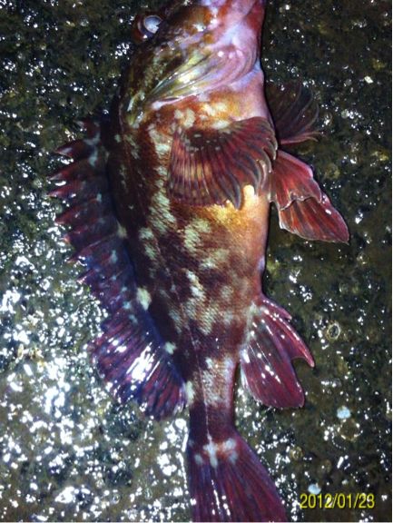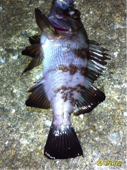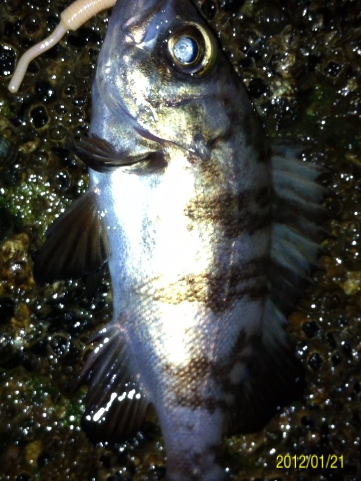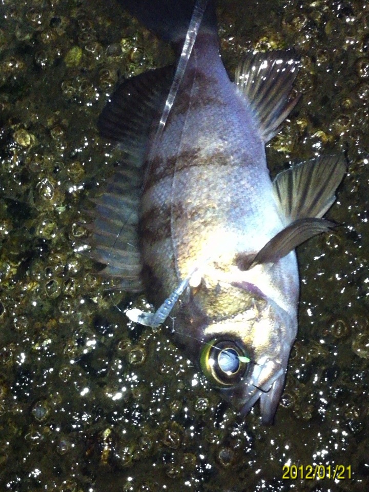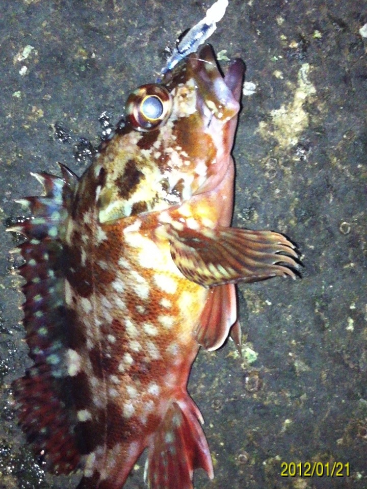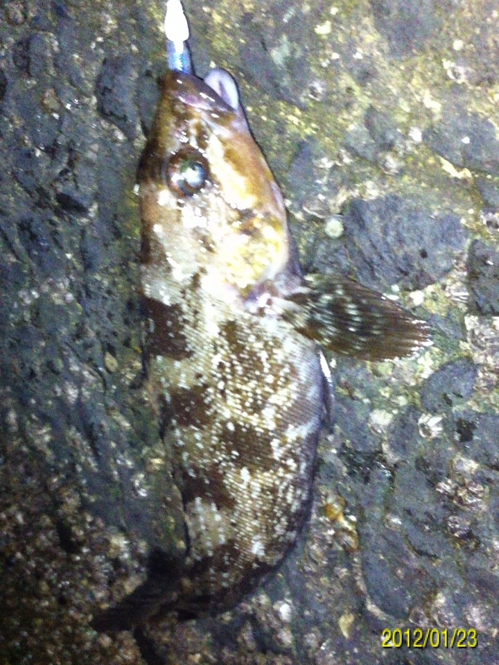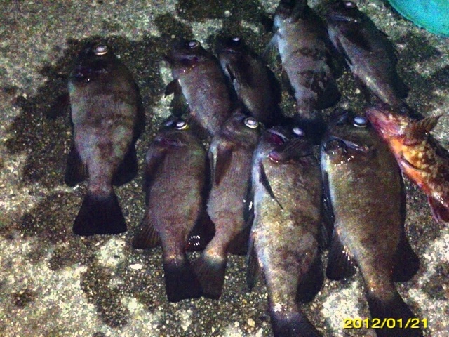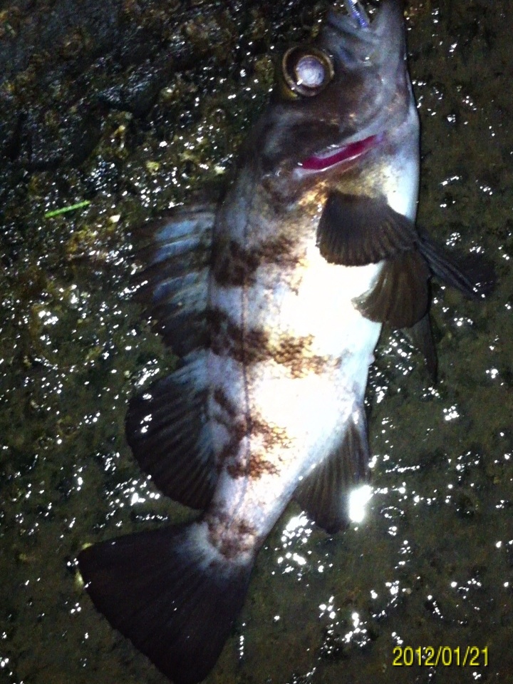 和歌山市内の防波堤でライトゲームをしました。 天気:曇り 気温:6度 風:北東3m 潮:大潮の上げ 前回好調だったメバリングですが、今夜も楽しませて貰えるのかな(^-^) ポイントに到着後、まずは坊主逃れの為に常夜灯下に向かいます。 先日と同様のリグ(ジグヘッド0.4g+クリアカラーワーム)でキャスト開始。 着水して5カウント・・・レンジをキープしながら、もうこれ以上ゆっくり巻けないと言う位のスピードでリトリーブ・・・ コツンッ!! 触った!! けど、フックにのってない・・・ 我慢してそのまま巻いていると・・・ コンッ!!ググググンッ!! きました~!! リリースサイズのメバルでした(^_^;) 先日も記載しましたが、リリースサイズが釣れた場所でまだ釣りをするので有れば、その場にリリースせずに離れた所にリリースしましょう。 面倒だけど、ポイントの活性は保つことができます。 と言うわけで、離れた所にリリースしました(^-^) その後もスグに・・・ 2匹目 3匹目 4匹目 5匹目 6匹目 爆釣です!! 立て続けにリリースサイズが、ほぼ入れ食い状態です。 もう面倒なので、バッカンに海水を入れて活かしておいて最後にリリースします(^^;; こんな時は定期的にバッカンの海水を入れ替えしましょう!! 入れ替え無ければ、酸欠になって死んでしまいます。 その後、表層付近で・・・ こんなものが喰ってきました。 いいサイズの小アジです。 連チャンできました!! 今夜はメバルがターゲットなので、気を取り直して少しレンジを下げてみると・・・ 7匹目 8匹目 9匹目 10匹目 11匹目 今まで仕留めたメバルは全てリリースサイズです(^^;; このままではメバルのお土産が無い・・・ヤバイ(^_^;) 常夜灯下は小さいメバルばかりなので諦めて、暗闇ゾーンで勝負することにしました。 大きなメバルはボトム付近にいると聞いたことがあったので、ボトムを攻めてみると・・・。 喰ってきたのは アイナメでした(^_^;) その後も暗闇ゾーンでボトム付近をリトリーブしていると・・・ まあまあのサイズのガシラ 次も・・・ 底を引っ張るとガシラに当たってしまう(^_^;) でも美味しいので持ち帰り決定。 そして・・・ やっとそこそこのサイズのメバルがきました。 良型は常夜灯よりも暗闇ゾーンの方が良さそうです(^-^) そして終了間際にも メバルは全部で13匹でした。 撮影後スグにリリースサイズのメバルを海に放流・・・ 残った子達です。 今回わかったこと・・・ ・常夜灯周りはサイズが小さいメバルが多い。 ・良型は暗い場所で深めのレンジ(底を若干切ること)を通すと確立アップ。 ・底を切らなければ、ガシラやアイナメに当たる。 今回は短時間で色んな魚達に出会えました(^-^) 今夜の晩御飯の食材にします(^-^)/ にほんブログ村 |