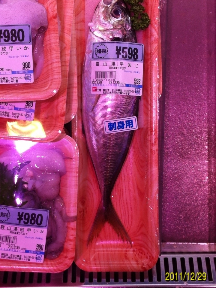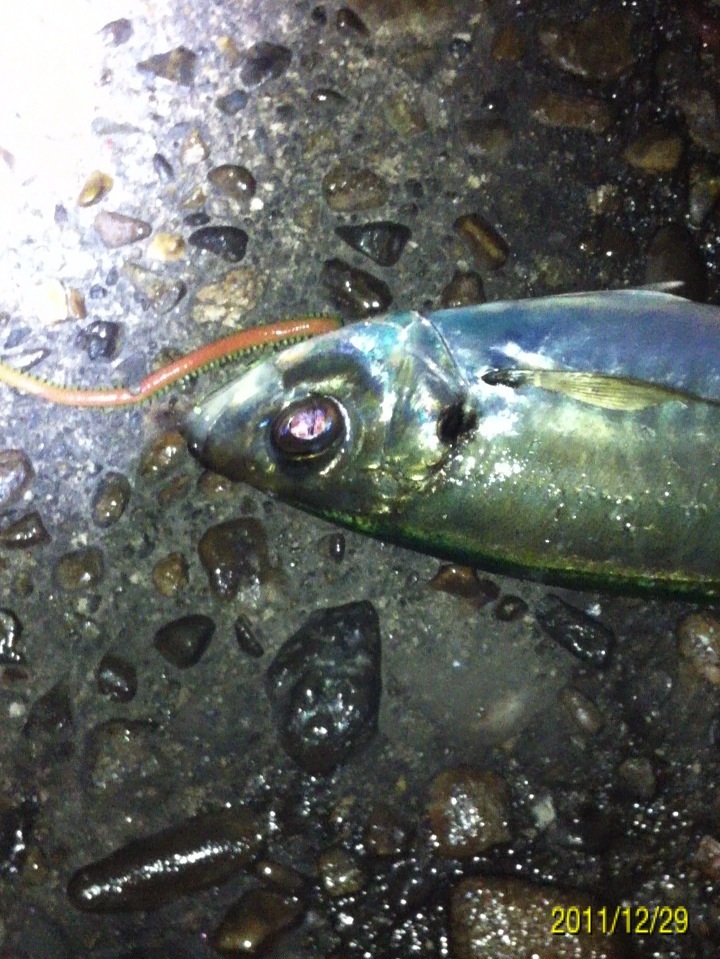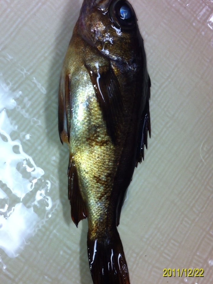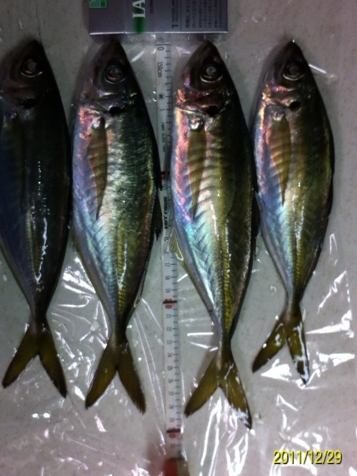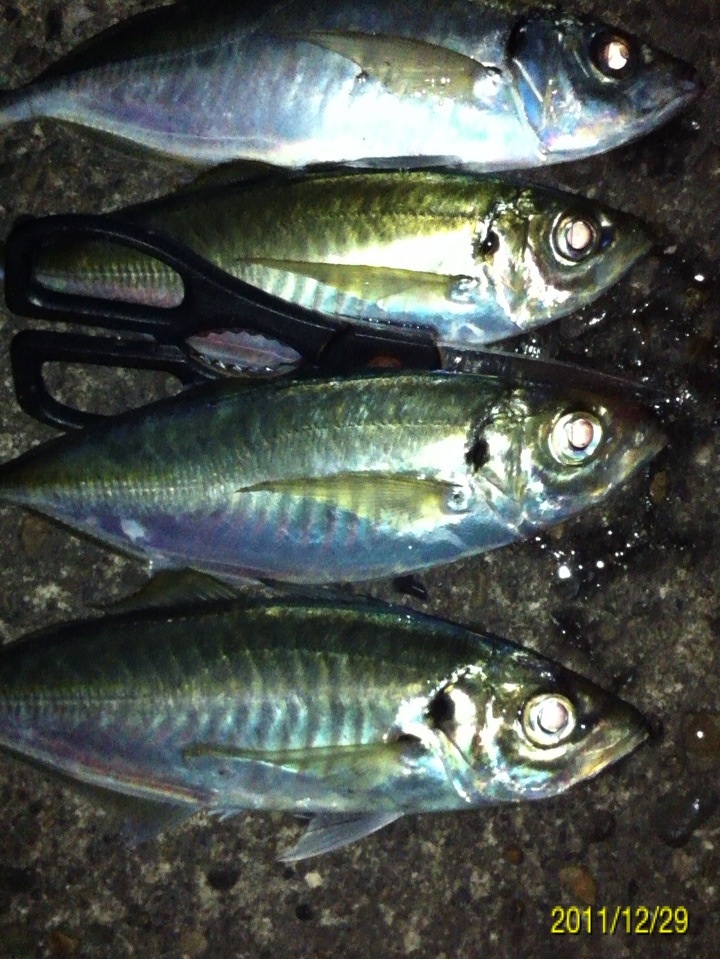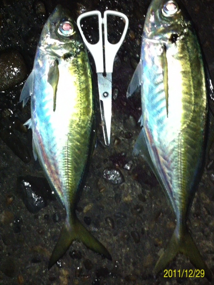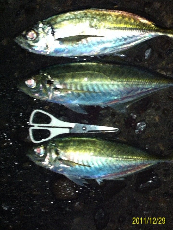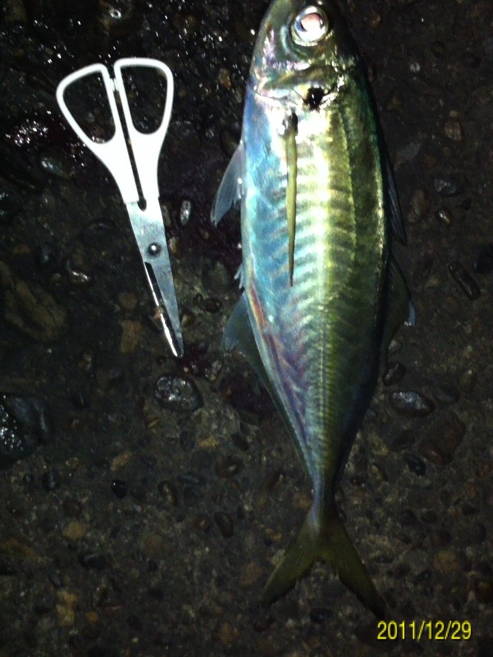 今年最後の釣りに行ってきました。 狙いはライトゲームでガシラ、メバル、アジですが、メインターゲットは前回の釣行の中で後半に釣果のあった、デカアジを仕留めることです。 ここ最近和歌山市の水軒から加太の大波止にかけて釣果情報が上がっているヒラアジの引きを満喫してみたいと思います。 ちなみにヒラアジの相場はというと・・・ 結構するんや~。 ポイントは情報にたよって、和歌山港周辺です。 気候のほうは 気温は4度ですが、風はほとんどありません。 潮は中潮の下げパターン 海水温は いいのか悪いのか・・・。 ポイントに到着して早速表層にいるアジを探します。 探し方は結構簡単・・・海面にヘッドランプをあてて赤い小さな反射光が有ればアジの可能性が高いです。 アジの眼の水晶体はライトに当たると赤く反射します。 やみくもにワームを投げるより、アジを探して、居るポイントに投げる方が釣果が上がると思います。 しかし、30分ほど探しましたが赤い小さな光を見つけることができませんでした。 はは~ん!!今夜は底やな!! (何の根拠も無い推測です。) じゃあ、前回釣果のあったポイントで底をワームで引いてみよう。 僕のリグは90%がキャロです。 釣れるから使ってるのか、こればかり使ってるのでヒット率が高いのか? 僕はわかりませんが、相性のよいリグです。 海に来てから、かれこれ4、50分たって、やっとワームを投入!! 完全に底を取ってから、大きくしゃくりあげ、ワームをフォールさせま・・・・グインッ!!オッなんか喰った!! この引き方は・・・前回の釣行でデカアジの引き方を知った僕は、すぐにわかりました。 クサフグ・・・でした_| ̄|○ 写真に撮るのも面倒なので画像はありません。 その後も・・・5~15センチ程度のクサフグの猛攻が続きます。 ワームの尻尾が噛み切られ、使いものになりません・・・イライラ・・・。 気分転換にタバコを一服。 ボーッと海を眺めていると・・・ 赤い小さな光!! アジ!! アジおるやん!! 表層におるやん!! すかさずワームを投入!! カウントダウンというか、着水してスグに喰いついてきました。 ええアジや~!! まだ赤い光が見えてるんで、再度ワーム投入!! 今度はカウントダウン5のスローリトリーブの途中でアタックしてきました!! これもいいアジやん!! 家族4人なんで、デカアジ4匹釣って帰るぞ~!! 同じパターンで・・・・ あと一匹で最低ノルマ達成。 先程まではママワームのグローカラーの2インチを使っていたのですが、確実に仕留めたいのでガルプサンドワームにチェンジ!! 予想的中!! きました~!! その後はピタリとアタリも無くなりストップフィッシング。 最終釣果は サイズがわかりにくいので、もうワンショット。 最大ジャスト30センチでした。 前回よりも少し小さいですが、年内最後の釣行でターゲットを仕留めることができて大満足の結果でした。 次回のブログ更新は年明けになりそうです。 内容は「アジ料理いろいろ」かな? 来年も懲りずに釣りに行きまくる予定です。 釣果があろうと、なかろうと今まで通り100%アップしていきますので、今後ともお付き合いよろしくお願いいたします。 皆様、良いお年をお迎え下さい。 にほんブログ村 |