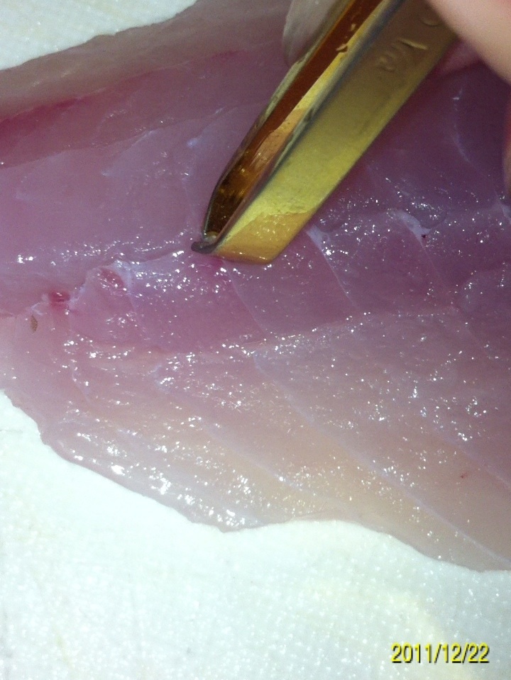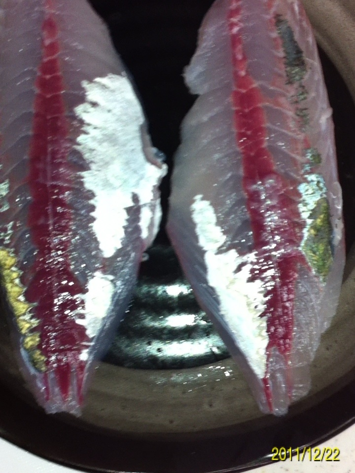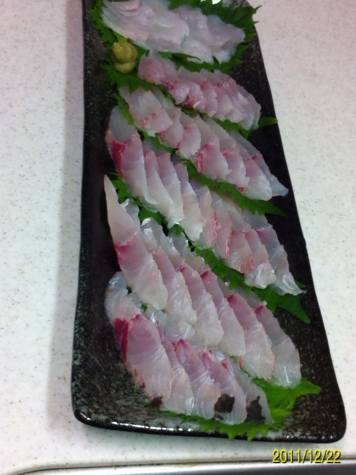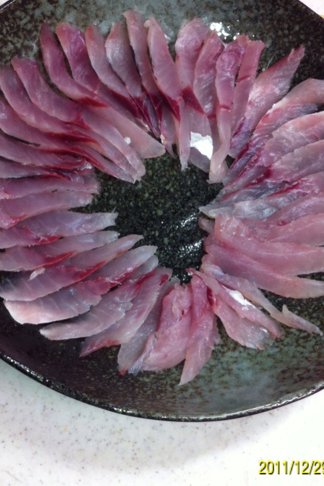 まずはメバルの薄造りから。 ウロコと頭、ワタを取ります。 3枚におろします。 皮を剥がします。 できるだけ薄く、できるだけ斜めに包丁を入れます。 大葉の上にこんな風に並べていきます。 完成です。 続いてアジの刺身です。 ウロコ、頭を取り3枚におろします。 皮を剥がします。 小骨を全て抜きます。 一口サイズに包丁を入れます。 器に盛り付けていきます。 完成です。 新鮮な魚は刺身が一番!! にほんブログ村 |