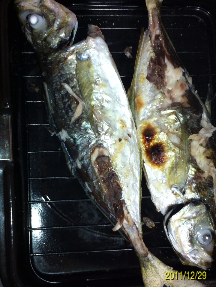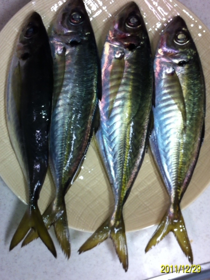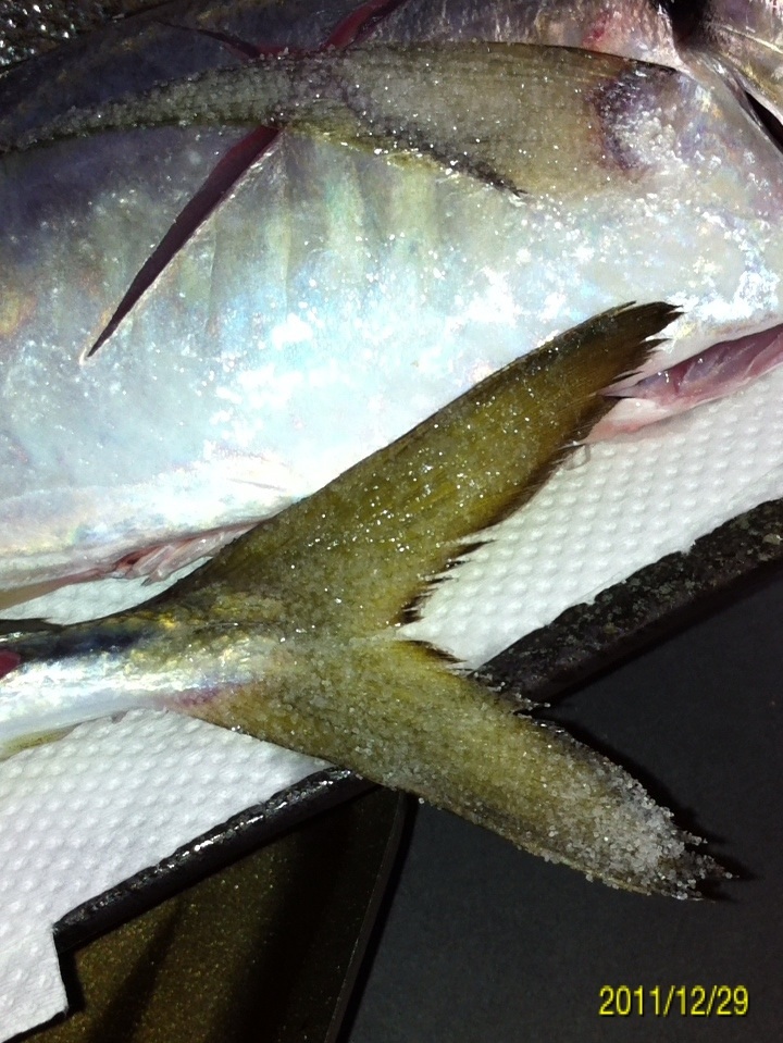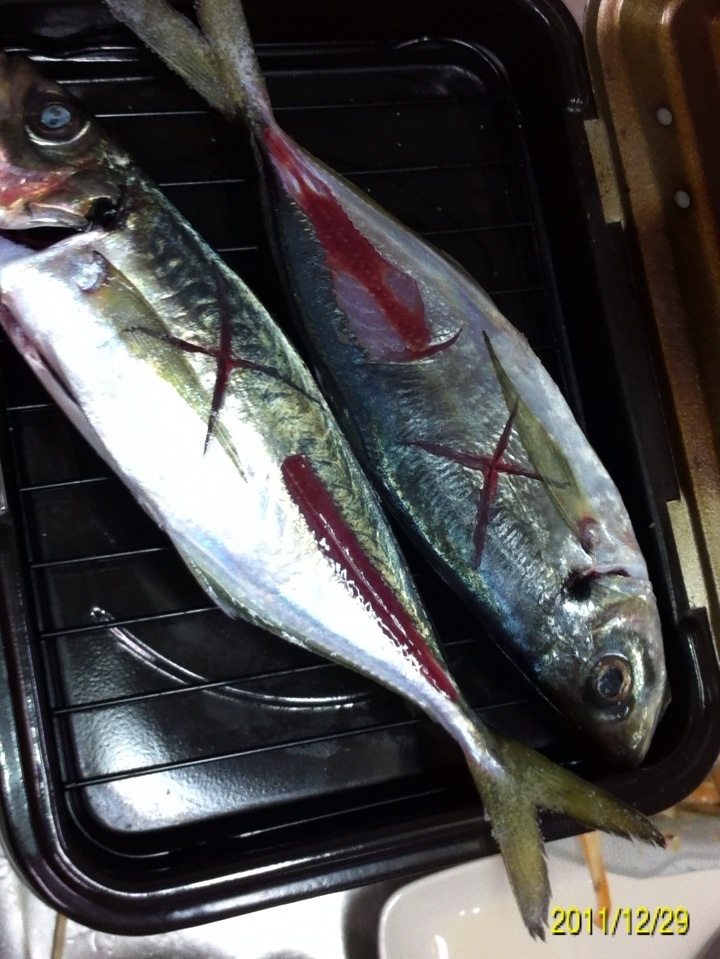 今回はアジの塩焼きです。 ウロコ、ワタ、ゼイゴをとります。 胴体に包丁で十字の切れ目を入れます。 全体に塩をまぶします。 ヒレの部分は焦げやすいので、しっかりと化粧塩をします。 魚焼き器に入れて両面を焼きます。 焼き加減は表面に汁が出てくれば、中に火が通った合図です。 柔らかいのが好きな方は、このタイミングで完成です。 僕はしっかり焼いた方が好きなので、もう少し焼きます。 完成です。 アツアツが美味い!! にほんブログ村 |