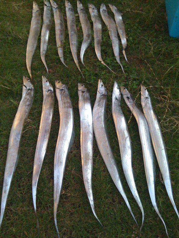 開始早々に爆釣モードスタート!! 竿2本でやってたけど、忙しすぎて1本に変更。食べる分は十分確保したところで、納竿しました。 今夜はタチウオづくし。 |