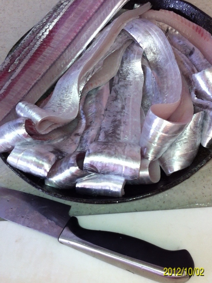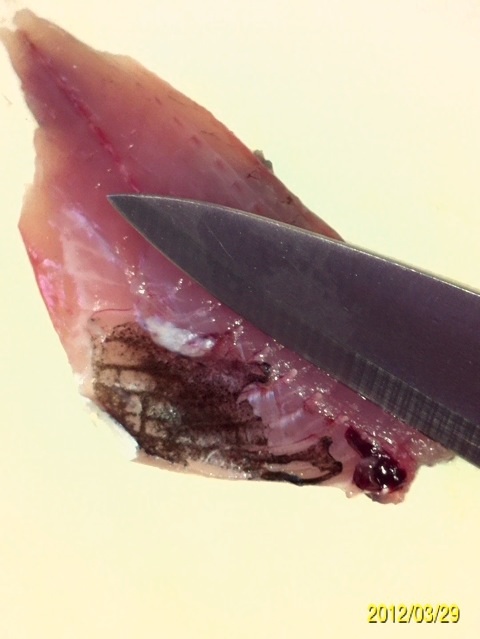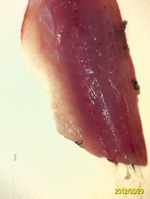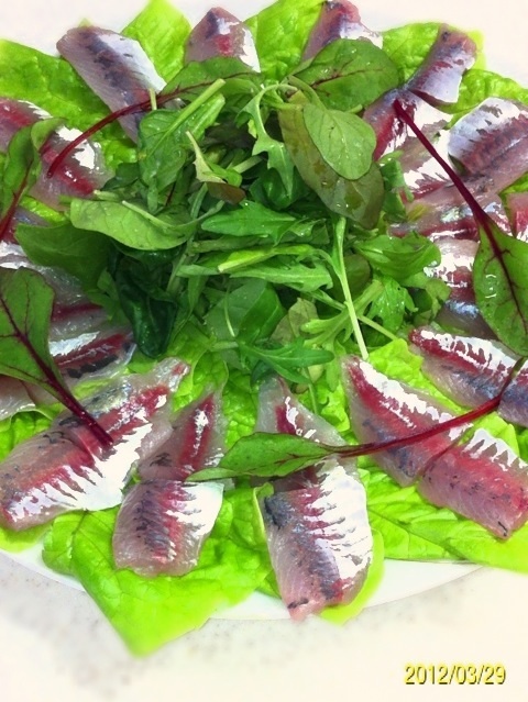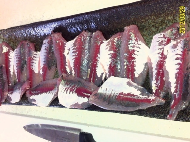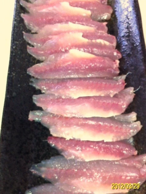 今回は手作りドレッシングを使ったカルパッチョにします。 昨夜のアジングに関しては、記事の掲載をサボらせて頂きますが、0.4gのジグヘッドに2.3インチのクリアカラーのワームで表層を漂わせて釣りました。 釣果は8匹でした。 これだけ有れば家族4人が新鮮なうちに美味しく食べる量としては充分過ぎなので、一応に満足のいく釣果だったと思います。 最初に、釣ったその場で〆て、エラ、ワタを取って綺麗に洗って海水に漬けておきます。 料理バサミで頭とヒレからカマの部分を落とします。 3枚におろします。 皮を剥がします。 写真のようにお腹の骨を包丁ですくうような感じで切り取ります。 骨抜きを使って、小骨を全て抜き取ります。 次はドレッシングを作ります。 玉ねぎを1/4程度おろし金でおろし、砂糖小さじ1、塩ひとつまみ、ブラックペッパー少々、お酢小さじ2、醤油小さじ1、レモン汁少々、オリーブオイル大さじ3、おろしニンニク小さじ1/2、バジル・パセリ・オレガノ少々をボールに入れてよく混ぜます。 味見をして、お好みの味に調整します。 ドレッシング完成 次は野菜を準備 ベビーリーフやヘルシーパオなどの野菜を写真のように盛り付けます。 アジを1/2(一口サイズ)に切って綺麗に盛り付けます。 仕上げは手作りドレッシングを回しかけて完成です。 刺身に飽きたかたは、ぜひカルパッチョをお試しください。 ドレッシングは手作りじゃ無くても、市販のイタリアンドレッシングでも充分美味しいですよ(^-^)/ 「にほんブログ村」海釣り部門人気ランキングに参加中です。面白い!参考になった!他の方の釣りブログも見てみたい!と思われた方は下のアイコンをクリックして下さい(^-^)/ にほんブログ村 |