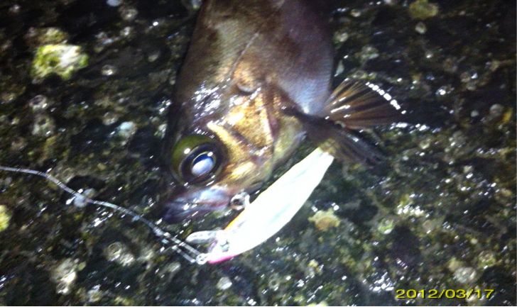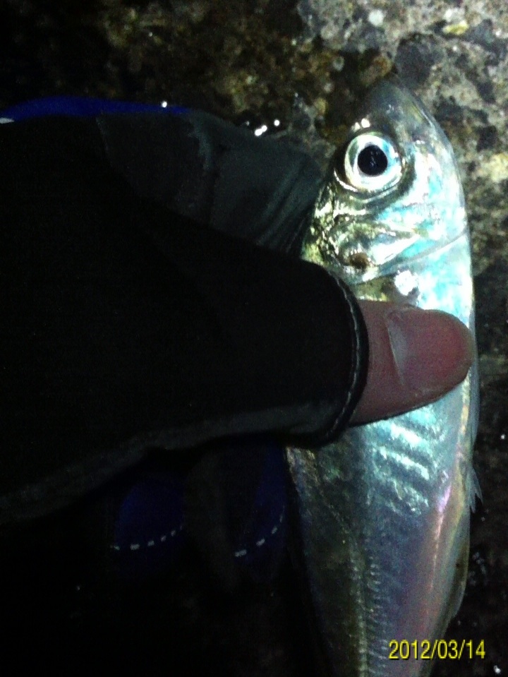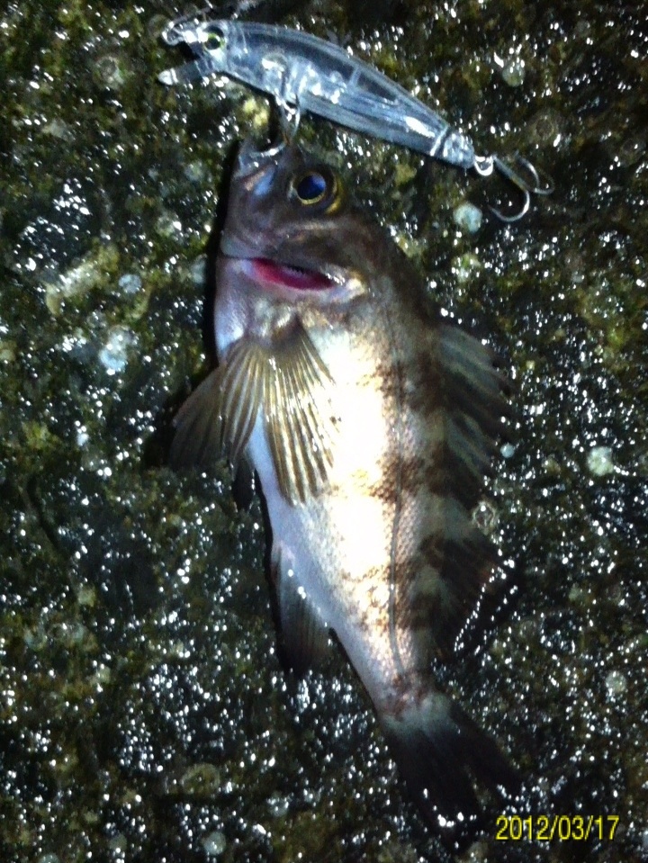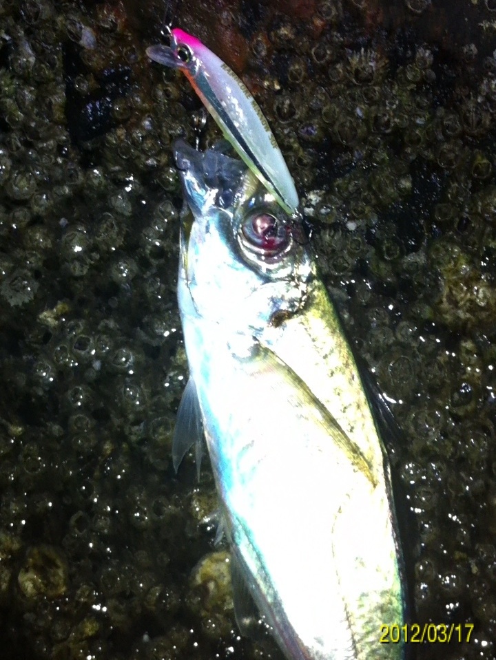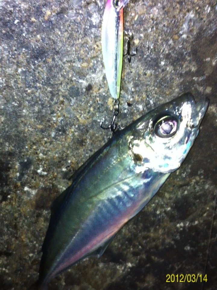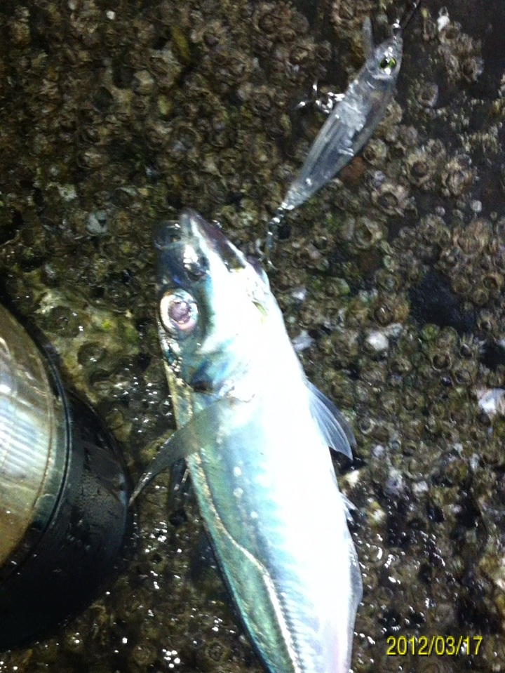 和歌山市内の堤防でアジングをして来ました。 当日のコンディションは 天気:曇り 気温:2~1度 風:西2~3m 潮:小潮 満潮からの下げ 海面はまるでプールのように穏やかな状態です。 ふと頭にこの言葉がよぎりました 「メバル凪・・・」 「メバルは凪を釣れ」って言葉もあるし・・・。 アジングをしに来たのですが、状況からみてメバルのほうが良さそうなので、まずは50ミリのフローティングミノーをキャストしてみます。 キャストしてリトリーブしているとスグにメバルらしき(?)アタリが!! 巻き上げて見るとそれは・・・ アジでした(^_^;) よく見るとスレ掛かりです。 たまたま引っかかったんでしょうね。 しかし次も・・・ *写真ぶれてます(^_^;) 今度はルアーをしっかり喰ってる!! ってことは・・・ アジもミノーで釣れる!! その後ベイトチェックをして見ると、お腹の中にはボラの稚魚が数匹入ってました。 これを参考に40ミリのジグミノーにチェンジ。 すると・・・ やはりアジはフィッシュイーターですね。 次はクリアカラーのフローティングミノーにチェンジ。 ゴツンッ!! 大きなアタリです!! これは・・・・!! やはりシーバスでした(^_^) 約40センチ 今夜はシーバスを持ち帰って料理してみます。 聞いた話ですが釣ってスグに〆てワタを出して皮のヌメリを綺麗に洗っておけば、臭みも無く美味しくいただけるそうです。 ちなみにシーバスもボラの稚魚を大量に喰ってました。 その後アジのアタリが少なくなってきました。 今度は波止際で何かがヒット!! アシストフックにスレ掛かりのメバルちゃんでした(^_^;) 小さいのでリリース 次も際でヒット!! 小さいな~ リリース 今度こそ!! 今夜は小さいメバルばかりが喰ってきます。 今度は今までと違うアタリが!! 小さいガシラちゃんでした(^_^;) ここでストップフィッシングです。 最終釣果 アジ×15匹 シーバス(マル)×1匹 メバル×3匹 ガシラ×1匹 ライトゲームで4目釣れました(^_^) アジは帰ってスグにお刺身にしました。 小骨を抜くのが面倒臭いですが、スゴく美味しいのでやってみる価値ありますよ(^-^)/ 「にほんブログ村」海釣り部門人気ランキングに参加中です。面白い!参考になった!他の方の釣りブログも見てみたい!と思われた方は下のアイコンをクリックして下さい(^-^)/ にほんブログ村 |