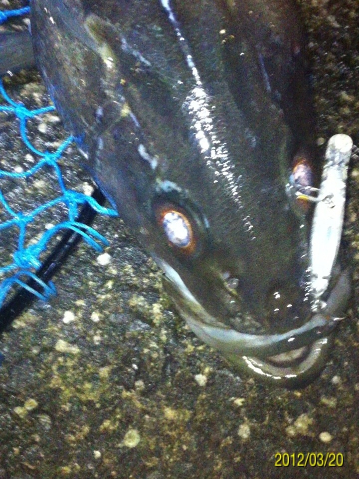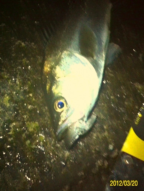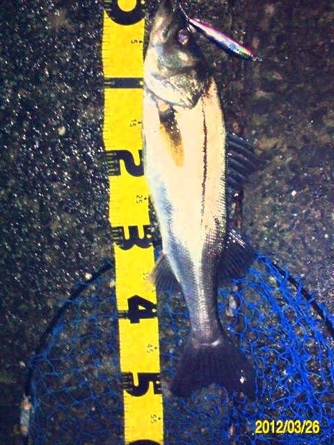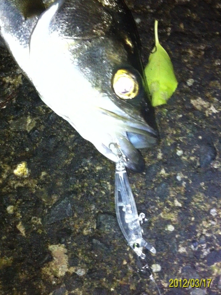 短時間釣行に行って来ました。 今回は時間が少ないので、坊主の可能性も有りますが、最近ハマっているシーバスを狙ってみたいと思います。 初の坊主報告記事になる可能性があるな・・・ 今夜のコンディションは 天気:曇り 気温:8度 風:東4~6m 潮:中潮の下げ(終了予定の23:30が干潮) シーバスのライズ:有り 波止際のベイト確認:ボラ稚魚が結構浮いてる 最近のマイポイントでのシーバスのベイトは3~4センチのボラの稚魚がほとんどなので、それに合わせた小さいミノーで勝負します。 釣り雑誌の記事に掲載されていたのですが、ボラの稚魚は夜間でも昼間でも深場には潜らず、常に表層で群れで活動しているらしい・・・・ コレが本当ならばボラの稚魚を捕食しているシーバスに関しては、フローティング系のミノーが有れば充分仕留める事ができるはず・・・? しかし今夜の風はポイントに対して向い風になるので、ラインが風にはらんでキャストしにくいです・・・。 我慢してキャストを続けてると・・・・ ググググッ!! 喰ってきました~!! が、フッキングには至らず・・・ シーバスは捕食が下手という情報を聞いた事がある。 少しアクションに手を加えよう・・・ 今までは ①キャスト~着水 ②少し放置(ドリフト) ③トゥイッチ(2回) ④スローリトリーブ 主にこの①~④をリピートしてたのですが、今回は一つ追加して項目⑤を入れてやってみたいと思います。 その項目⑤は・・・ ストップ&ゴーです 捕食が下手なシーバスに対して ルアーを止めてあげる事で、喰いつくタイミングを与える・・・ というわけで、⑤の項目を加えてリトリーブを繰り返していると・・・ なんと足元の見える位置まで、シーバスがルアーをゆっくりと追って来てました!! メッチャルアーを見てる!! 様子をうかがってるようです・・・ どうすべきか? とっさに思い付いたアクションは・・・ 棒引きでした(^_^;) スーッと水平にルアーをゆっくり引くと・・・・ 喰いついた!! いつもより強い引き味です!! 慎重にネットを使ってランディング!! やった!! 見えシーバスを仕留めました!! シーバスをストップ&ゴーで、しかもサイトフィッシングで釣った~!! そして先日よりもサイズアップ!! 約60センチ!! ベイト確認をして見ると、大量のボラの稚魚が入っていました。 想定通りに釣る事ができたので、嬉しさ倍増です(^_^) その後、タイムアップの時間が迫ってきたところで再度アタリが!! サイズは42センチでした。 2本仕留めたところでストップフィッシングといたしました。 これで完全にシーバスにハマっちゃいました(^_^;) 次回は更にサイズアップを目標に頑張ります(^-^)/ 「にほんブログ村」海釣り部門人気ランキングに参加中です。面白い!参考になった!他の方の釣りブログも見てみたい!と思われた方は下のアイコンをクリックして下さい(^-^)/ にほんブログ村 |