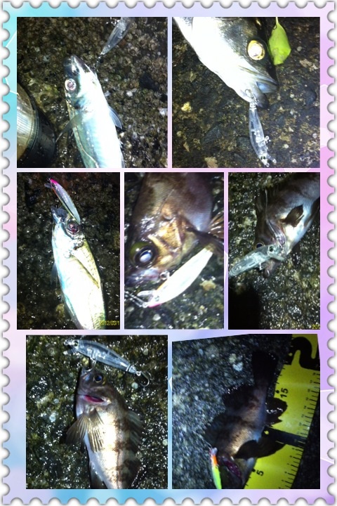 和歌山市のマイポイントへ行ってきました。 今回はテーマを決めてやってみたいと思います。 そのテーマは・・・ 「プラッキング」です。 いつもはソフトルアー(ワーム)を中心に使用した釣りをしてますが、たまに使うミノーで釣れた時って、スゴく嬉しい・・・・。 それは僕の中ではハードルアーは釣りにくく、ソフトルアーは釣りやすいと言った思い込みが有るからでは無いか・・・? ハードルアーばかり使えば、ワームと同じように釣れるかも・・・? と言うわけで、今回は苦手意識克服のためにも、ワームは一切使いません!! 当日のコンディション 天気:曇り 気温:13~15度(いつもの格好なら暑いです) 風:ほぼ無風 潮:長潮の下げ~上げ それではスタートフィッシングです!! まずは透明のフローティングタイプのミノーをセットしてキャストしていきます。 リトリーブしていると時々何かがルアーにアタックしているような感触が伝わってきますが、フッキングには持ち込めない・・・。 多分小アジでしょうね。 口を使って無いのかな? しばらく我慢してキャストしていると・・・。 やっと待望の本アタリです!! アジです!! 今夜もアジが居るぞ!! 口が切れやすいので大きく合わせるのはやめておこう・・・。 そして次のキャストでもアタリが!! アジ(思い込み)なので、軽めに合わせると・・・ グイーン!! んッ!! 違う!!シーバスや!! ヤバッ!! 合わせが甘い!! 案の定フックアウト・・・ どうすべきか? シーバスも仕留めたい!! アジなら口が切れるかもしれませんが、強く合わせることに決意しました。 数投後・・・ アタリがきました!! アジかシーバスかわからんけど・・・・ 鬼合わせ~!! ガツンッ!! 決まった~!! シーバスです。 小さいですが(40センチ前後)・・・ 今の合わせをアジにお見舞いしてたら、多分吹っ飛んできたかもしれないな・・・ その後しばらくアタリが遠のき、ルアーを見切られてるような気がしたので、カラーチェンジすると・・・・ きました!! 強目に合わせましたが、口が切れる事なくゲットできました。 そして波止際を通してみると・・・ 予想通り・・・ メバルがきました!! その後も・・・ 連発で・・・ 時間が迫ってきたので、そろそろ終わろうかなと思っていたら・・・・ 少しサイズアップ? 最終的には アジ×4 メバル×4(リリース3) シーバス×1 ワームを使わなくても、結構釣れるんですね。 ハードルアーの苦手意識・・・・チョットだけ克服です(^-^)/ 「にほんブログ村」海釣り部門人気ランキングに参加中です。面白い!参考になった!他の方の釣りブログも見てみたい!と思われた方は下のアイコンをクリックして下さい(^-^)/ にほんブログ村 |